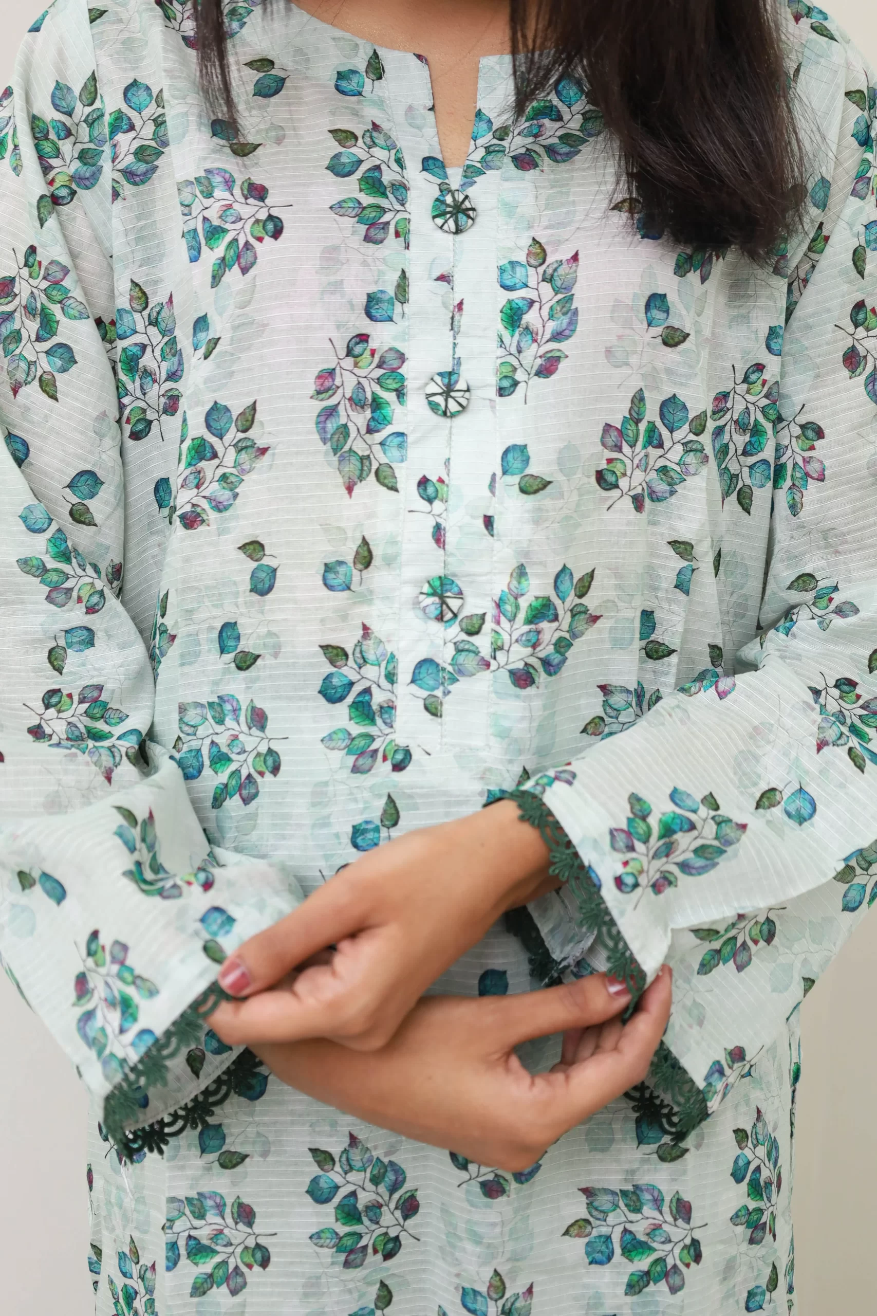 Elevate your style effortlessly with our premium Rod lawn collection in soft pastel green shades, crafted to leave a lasting impression. Our subtly printed shirt features delicate buttons at the neckline and intricate lace details on the sleeves and hem, perfectly complemented by straight, loose trousers for a refined and polished ensemble.